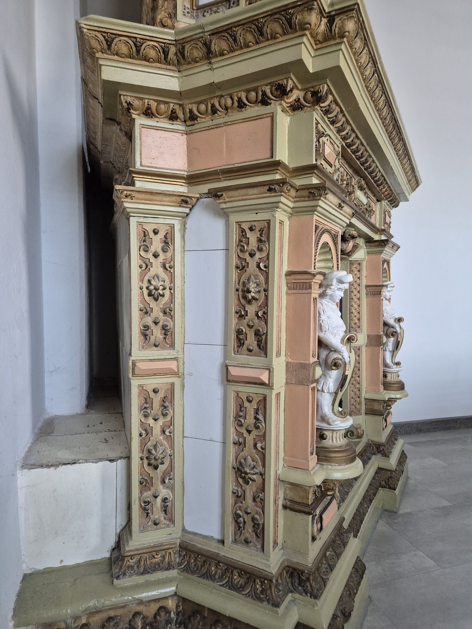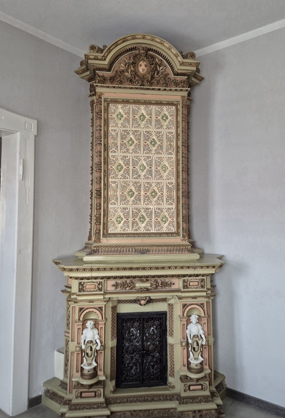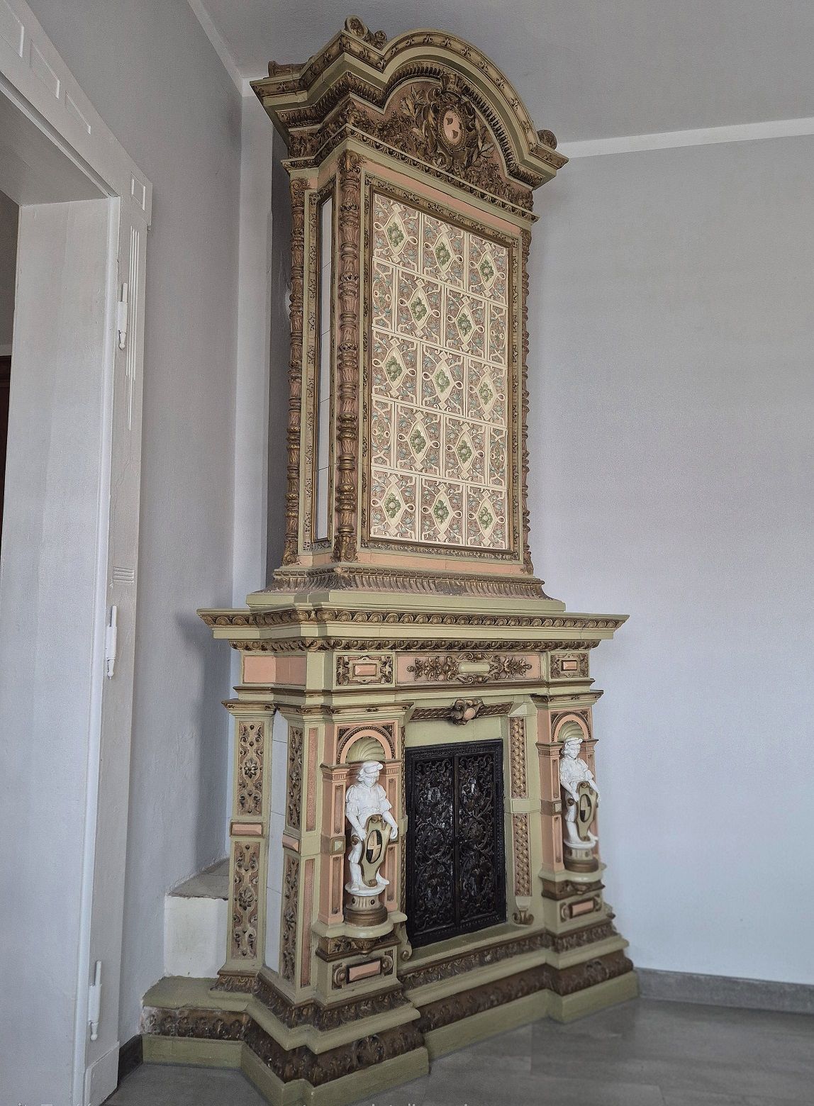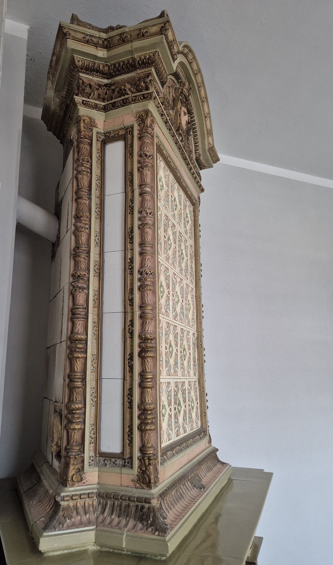 Jak to się stało, że tak okazały piec znalazł się na rychtalskiej plebanii?. Tropy prowadzą do pobliskiego pałacu biskupów wrocławskich w Skoroszowie o którego burzliwych dziejach można przeczytać w dziale: Historia Rychtala w zakładce: Pałac biskupi w Skoroszowie. Nie sposób jednak z całą pewnością określić czasu w którym piec został przeniesiony do Rychtala. Może znalazł się na tutejszej plebanii na początku XX wieku, kiedy w 1904 roku została ona oddana do użytku, gdyż od 1810 roku pałac stał de facto pusty. Być może stało się to jednak dopiero w roku 1935, kiedy Rychtal i okolice znajdowały się już w granicach Rzeczypospolitej a pałac przejęło Ministerstwo Sprawiedliwości, tworząc w nim więzienie.