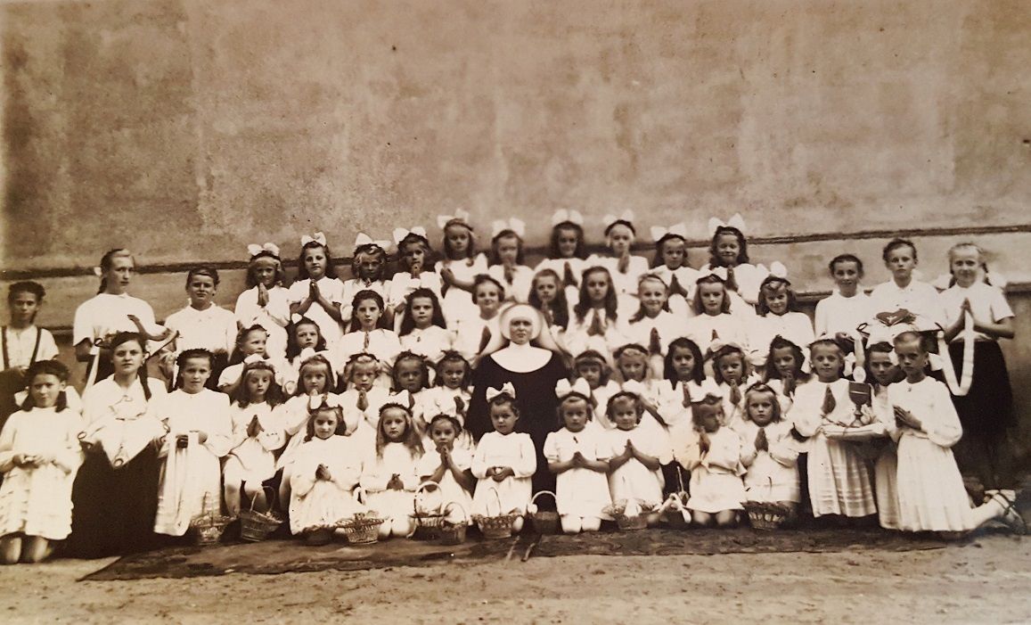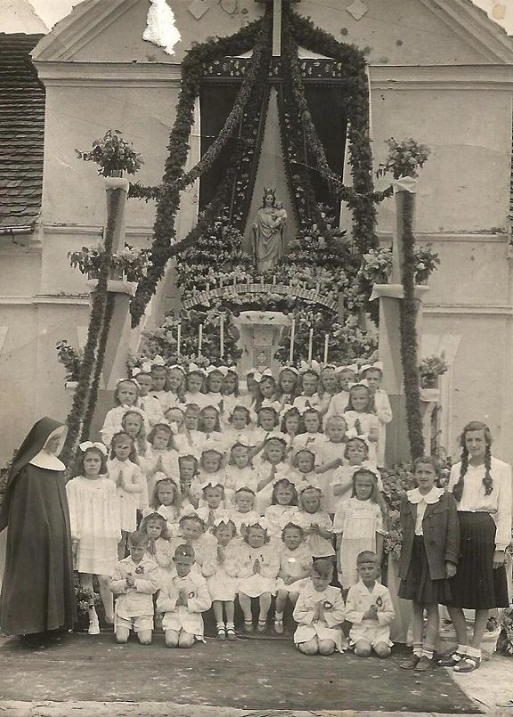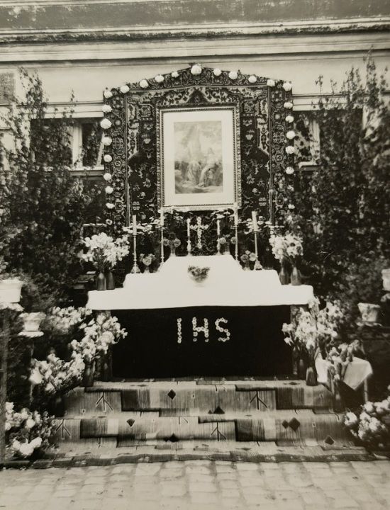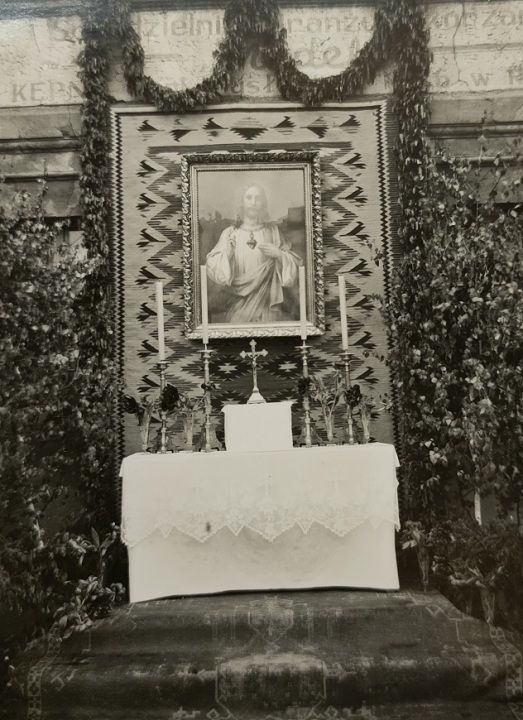Ołtarz Bożego Ciała przed budynkiem rodziny Wiercińskich przy ul. Kępińskiej w roku 1951 lub 1952.