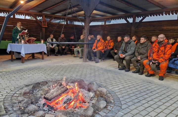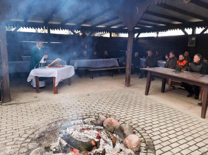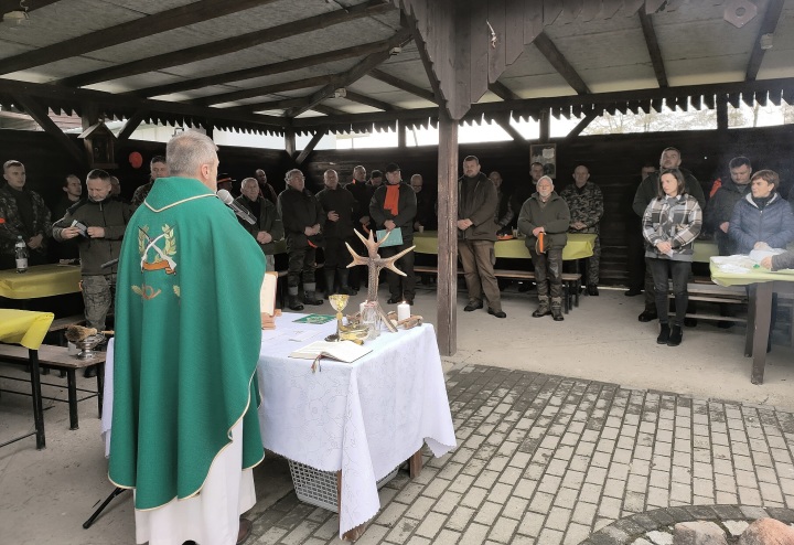 " ... jutro z rana Mszę miał w kaplicy leśnej: kruciuchna oferta/ Za myśliwych, msza zwykła świętego Huberta" ( Adam Mickiewicz "Pan Tadeusz" ) Msza na "Sadybie" dla Koła Łowieckiego "Jeleń" w Rychtalu przed polowaniem hubertowskim 4.11.2023r.