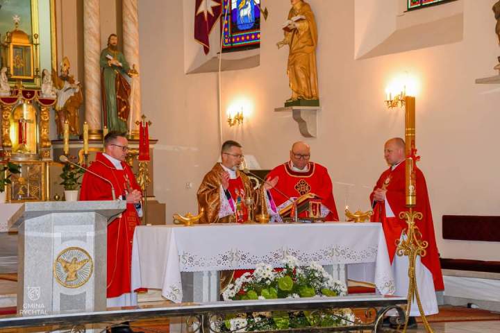 Drogie druhny, drodzy druhowie, siostry i bracia! W dniu takim jak ten dzisiejszy warto zadać sobie pytanie: Skąd w strażakach ochotnikach jest tak wielka siła do bezinteresownej służby w czasach w których ludzie wszystko zwykli przeliczać na pieniądze?. Bo co można mieć z tej służby jeżeli nie tylko poczucie, że spełniło się obowiązek płynący z przykazania miłości bliźniego? Bo co innego macie z tego, że w środku nocy zostawiacie ciepłe łóżko, i biegniecie żeby nieść pomoc drugiemu?. Jedyną nagrodą dla Was jest satysfakcja, że jest w Was ta siła, która pozwala wypełnić Wam to Boże przykazanie. Moi drodzy! Taką samą siłą charakteryzował się Wasz Patron św. Florian. Był on wysokiej rangi legionistą rzymskim. Kiedy za cesarza Dioklecjana rozpoczęło się prześladowanie chrześcijan i usłyszał on o prześladowaniu swoich braci, postanowił pospieszyć im z pomocą. Przez nikogo nie przymuszony, przez nikogo nie namawiany, chociaż wiedział że za taki czyn może czekać go śmierć. Moi drodzy! Kolor czerwony dzisiejszych szat liturgicznych, który oznacza męczeństwo jeszcze głośniej niż o krwi mówi o miłości. Bo tylko miłość wobec Boga, przeradzająca się w miłość względem drugiego człowieka daje człowiekowi siłę, żeby cenić bardziej pomoc drugiemu człowiekowi, niż własne życie, żeby cenić sobie tę służbę społeczną bardziej niż tak zwany „święty spokój”. Skąd czerpać tę siłę, żeby tej miłości, która jest w Was nigdy Wam nie zabrakło, żeby nigdy Wam nie zabrakło chęci pójścia z pomocą drugiemu człowiekowi?. Moi drodzy! Z pomocą przychodzi nam dzisiaj Słowo Boże, bo przecież brakuje ludzkich słów, żeby wyrazić tę rzeczywistość a Jezus w Ewangelii, którą Kościół daje nam do czytania na dzień dzisiejszy mówi, żeby mieć w sobie życie. Co to znaczy, że człowiek ma w sobie życie, bo przecież można się poruszać, fizjologicznie robić to, co człowiek robi ale tak naprawdę nie żyć i być tylko chodzącym trupem. Kiedy więc człowiek ma w sobie to prawdziwe życie, życie Boże? Ma je wtedy, kiedy to, co robi bezinteresownie przynosi mu szczęście. Warto więc zapytać siebie dzisiaj, czy jesteśmy szczęśliwi?. Czy jesteście szczęśliwi, że stanowicie tak zgraną drużynę, która mieszkańcom naszej Małej Ojczyzny Rychtala a czasem całkiem obcym ludziom niesie pomoc?. Proszę dzisiaj Waszego Patrona św. Floriana, żeby Wasza służba dla drugiego człowieka dawała Wam szczęście i radość z tego, że jesteście niejako dłońmi Pana Boga, kiedy wyciągacie swoje ręce, żeby nieść pomoc potrzebującemu człowiekowi. Amen