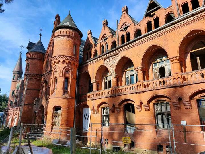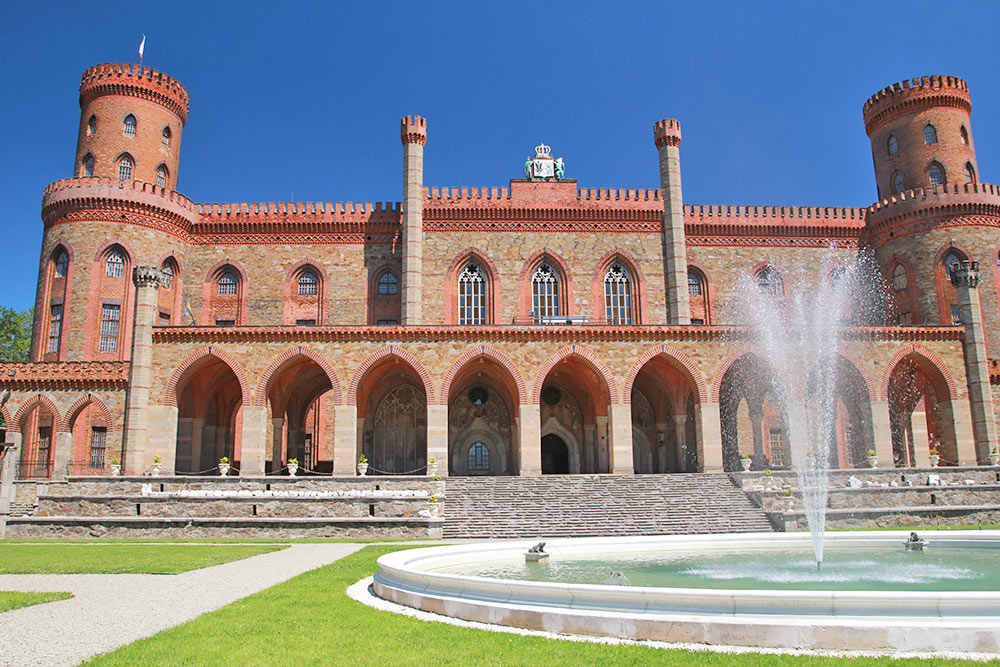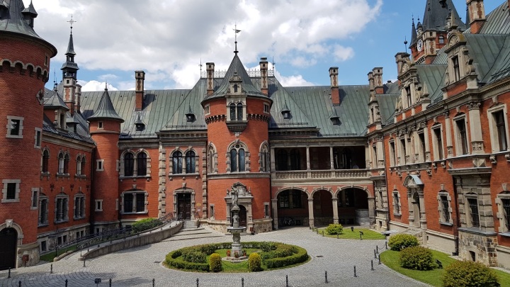Na wzniesieniu górującym ponad Kamieńcem Ząbkowickim na Dolnym Śląsku stoi piękny pałac Marianny Orańskiej. To prawdziwa perła architektoniczna nie tylko Kotliny Kłodzkiej, ale całej Polski! Już z daleka w oczy rzucają się cztery czerwone, okrągłe wierze wystające ponad konary drzew, przez co pałac przywodzi na myśl zamek. Skrzydła pałacu w Kamieńcu Ząbkowickim tworzą prostokątny dziedziniec wewnętrzny, otoczony otwartymi arkadami. Całość prezentuje styl neogotycki z nawiązaniem do architektury romańskiej. Budowa pałacu w Kamieńcu Ząbkowickim rozpoczęła się w 1838 roku. Wtedy to po raz pierwszy miejsce to odwiedziła Marianna Orańska - królewna niderlandzka, fundatorka pałacu i dobra Pani całej Kotliny. Odziedziczyła te ziemie po swej matce i postanowiła tu wybudować letnią rezydencję, która do dziś zapiera dech w piersi. Tworzenie pałacu nie przebiegało bez przeszkód, bowiem prace zostały wstrzymane z powodu rozwodu Marianny z Albrechtem. Był to skandal i za karę zabroniono Mariannie przebywać na terenie Prus dłużej niż przez 24 godziny. Marianna obeszła ten zakaz kupując posiadłość w pobliskiej Bilej Vodzie, skąd nadzorowała dalsze prace nad Pałacem, który przekazała swemu synowi Fryderykowi Wilhelmowi Albrechtowi. Budowa została ukończona w 1872 roku a jej koszt to równowartość trzech ton złota. Marianna Orańska zmarła w 1883 roku. Jej potomkowie rezydowali w pałacu do 1945 roku, kiedy musieli uciekać przed Armią Czerwoną, pozostawiając wszystkie dobra. Rok później pałac spłonął. Dzieła sztuki i wyposażenie pałacu wywieziono oraz rozgrabiono. Marmurowe podłogi oraz kolumny do dziś zdobią Pałac Kultury i Nauki w Warszawie. W 1986 roku pałac wydzierżawiono na 40 lat, jednak nie był to dobry czas dla obiektu. Zarośnięty i zaśmiecony tkwił przez lata i niszczał. Dopiero w 2013 roku wrócił w ręce zarządcy - Gminy Kamieniec Ząbkowicki i od kilku lat jest gruntownie rewitalizowany. Z każdym rokiem pięknieje pałac oraz jego otoczenie. Uruchomiono kilka z kilkudziesięciu fontann, które tu niegdyś funkcjonowały, a które czerpały wodę ze specjalnie przygotowanych basenów na szczycie.