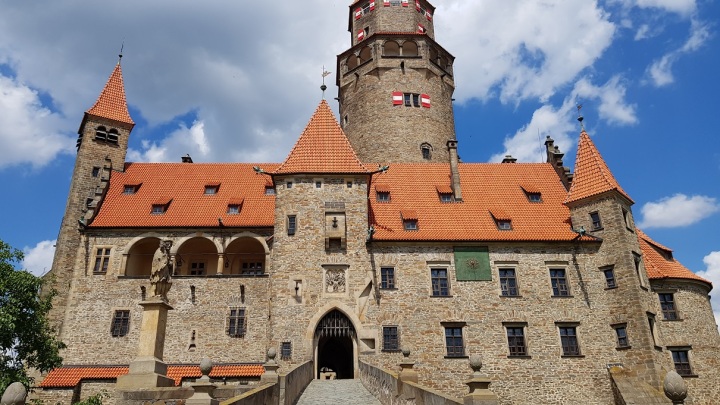 Romantyczny zamek Bouzov założony został na przełomie XIII i XIV wieku położony jest w malowniczym krajobrazie Litovel i Mohelnice. Do 1696 r. Był w posiadaniu naprzemiennie członków różnych rodzin czeskich i morawskich, następnie majątek wraz z zamkiem kupił zakon krzyżacki. Od 1945 r. Stanowi własność państwową. W 1999 roku został ogłoszony narodowym zabytkiem kultury. Zamek jest w pełni umeblowany i wyposażony w obrazy, dzieła sztuki, meble historyczne i robione na zamówienie. Dziś zamek uzyskał wygląd typowej romantycznej rezydencji z blankami, wykuszami, strzelnicami i rzygaczami po gruntownej przebudowie w latach 1896-1910. Wyjątkowe są dwa mosty zwodzone, które zwiedzający mogą zobaczyć w działaniu przy okazjach świątecznych - początek i koniec sezonu, otwarcie wystaw, jarmark zamkowy, karnawał itp.