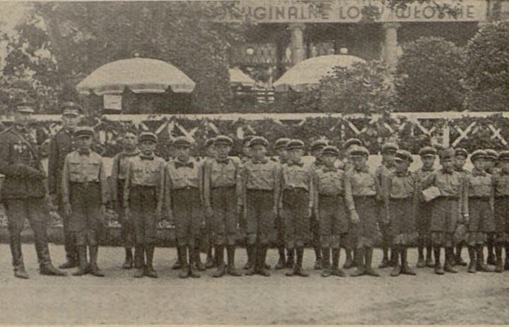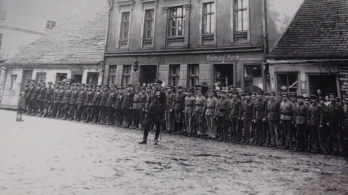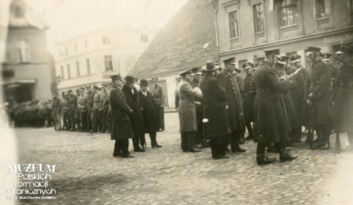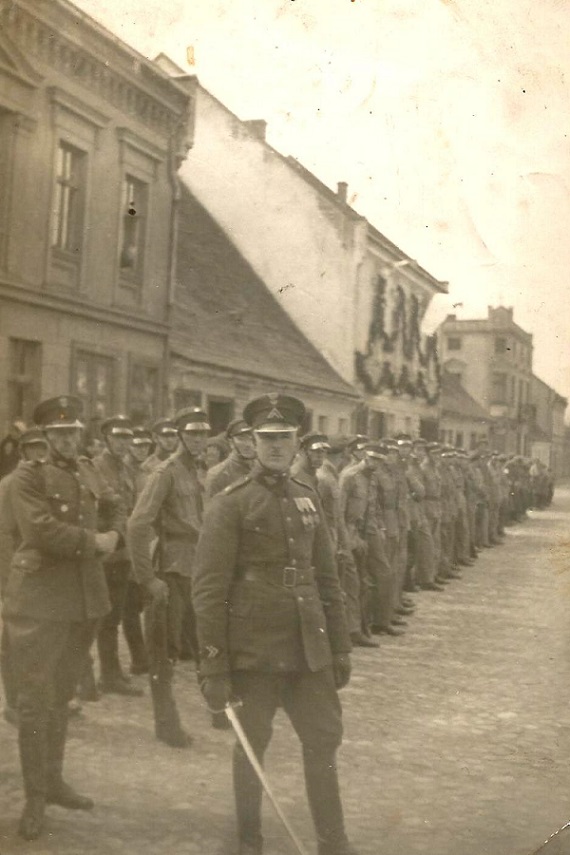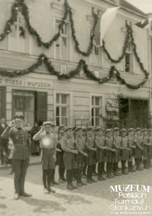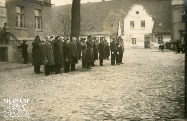 Obchody Święta Niepodległości 11.11.1934r. Zbiórka plutonu Straży Granicznej przed Komisariatem Straży Granicznej w Rychtalu. Osoby widoczne: brak danych. Prawdopodobnie jest to dawna willa Heidera na Zawadzie. W latach międzywojennych były tam mieszkania m.in. dla strażników granicznych. Wiadomość ta pochodzi od p. Kazimiery Kijak z Rychtala, której ojciec był strażnikiem granicznym w Rychtalu (tam mieszkali). Po lewej stronie widać drzwi oraz lekko wysunięty fragment budynku, po prawej widoczny jest fragment drugich drzwi wejściowych do budynku.