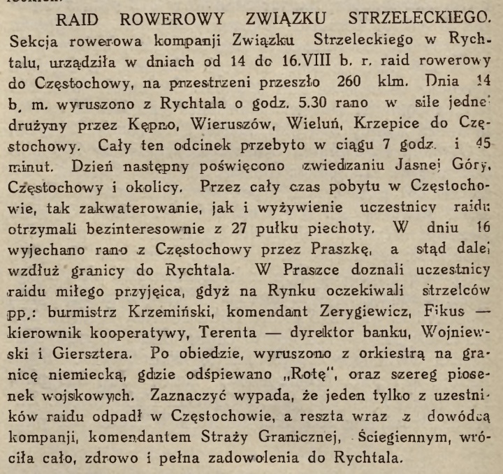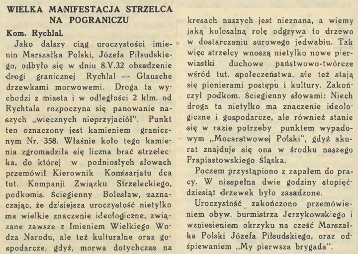 "W celu uczczenia konstytucji majowej i 11 rocznicy powstania śląskiego odbyły się w Rychtalu zawody sportowe Związku Strzeleckiego. Punktualnie o godz. 13,30 przybyli zawodnicy przy dźwiękach orkiestry na Rynek. W biegu sztafetowym na odległość 7 km I nagr. otrzymał strażnik Bartkowiak (Z.S. Droszki), II nagr. Pawelczyk (Z.S. Rychtal), III nagr. st. strażnik Kaszubkiewicz (Z.S. Rychtal). W wyścigach rowerowych na trasie 20 km I nagr. Machut (Z.S. Rychtal), II nagr. Pietruszka (Z.S. Rychtal), III nagr. Dastych (Z.S. Rychtal). W biegu na przełaj 3 km. I nagr. Sobek, II nagr. Sesenko (Z.S. Rychtal). W marszu zespołowym wzięły udział 4 drużyny: I nagr. drużyna Sadogóra, II nagr. drużyna Rychtal. W rzucie granatem: I nagr. otrzymał Szymański, II nagr. Różewski, III nagr. strażnik Bartkowiak (Z.S. Droszki). W strzelaniu zespołowem drużyna Droszki zajęła I miejsce i zdobyła nagrodę przechodnią, ufundowaną przez B.B.W.R. Rychtal. W ogólnej klasyfikacji Sesenko zdobył największą ilość punktów i otrzymał nagrodę przechodnią ufundowaną przez Z.S. Droszki, temsamem otrzymał tytuł mistrza kompanji na rok 1932. W ogólnej klasyfkacji zesp. drużyna Droszki zajęła I miejsce i otrzymała nagrodę ufund. przez p. Kuberę z Dworzyszcza."