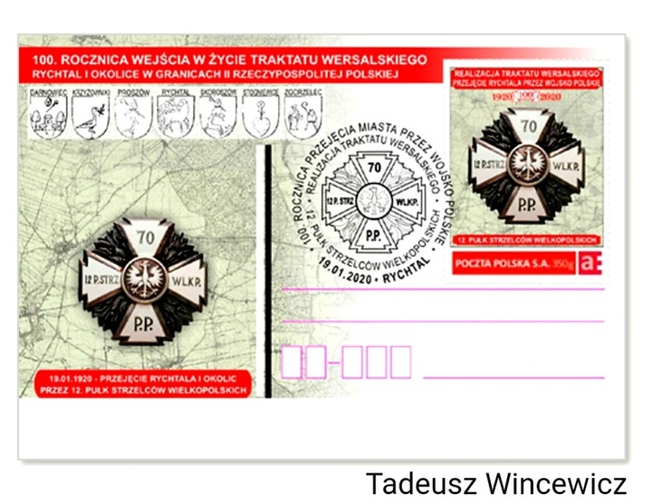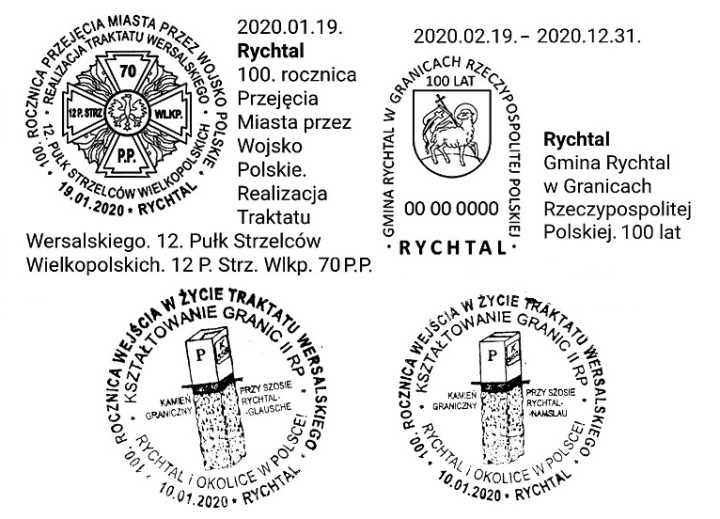 19 stycznia 2020 r. - 100. rocznica przejęcia Rychtala i okolic przez wojsko polskie - żołnierzy 12. Pułku Strzelców Wielkopolskich, który w lutym przemianowano na 70. Pułk Piechoty. Przejęcie tych ziem i włączenie ich w granice II Rzeczypospolitej to realizacja postanowień Traktatu Wersalskiego.Wydane zostały trzy wzory znaczków emisji:1. z rysunkiem herbu miasta Rychtal (Reichthal) obowiązującym do 1920 r.;2. z fotografią odznaki pułkowej 12. Pułku Strzelców Wielkopolskich - 70. Pułku Piechoty;3. z rysunkiem herbu Gminy Rychtal według wzoru obowiązującego od ubiegłego roku.Znaczki zostały wydane w arkuszu z okolicznościowymi napisami na marginesach, a także herbami niektórych wiosek ziemi rychtalskiej.